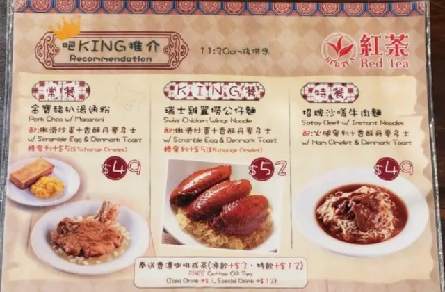幾欣賞的一間冰室 小狼822Level 32019-08-21247 views Follow 試過幾次紅茶冰室,但係其他分店,油麻地呢間係第一次試!最愛佢有幾款常餐/特餐供人選擇!因為筆者有選擇困難症,相反如果你靜係比幾款我揀,我會比較容易下決定!同埋,呢d常餐有埋野飲,亦係我鍾意佢嘅原因之一!招牌沙嗲牛肉麵 $49 (沙嗲牛肉算幾多,唔係得幾夠,麵唔會煮到淋曬)配:火腿奄列+香酥丹麥多士 (奄列唔算好油,邪惡😈又會致肥嘅丹麥多士好耐無食,幾香口)飲品: 茶走(忘了拍照,香滑,茶味都突出,奶味唔會覆蓋)Small Mui 嗌左瑞士汁雞翼撈公仔麵都幾好味,凍朱古力好飲,推介!The above review is the personal opinion of a user which does not represent OpenRice's point of view.LikeShare幾欣賞的一間冰室 紅茶冰室 https://s.openrice.com/QrKT0XP0r00Report Post Ratings5Taste5Decor5Service4Hygiene5ValueDate of Visit2019-08-17Dining MethodDine InSpending Per Head$52 (Lunch)