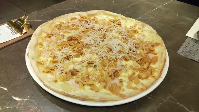 這間馳名的Garlic Snowing Pizza蝦,菠蘿,炸蒜片MGF 招牌意大利薄餅,餅底薄,但好香脆,有很多蒜片,侍在熱騰騰的Pizza 上芝士碎,濃郁的蒜香和芝士的香氣四溢,唾涎了,急不及待咬下,炸蒜香味芝士味道,鮮蝦的鮮味,還有開胃的酸甜菠蘿和酸汁,那一刻只合上眼晴去感受,充滿口腔的滋味,太棒了!
