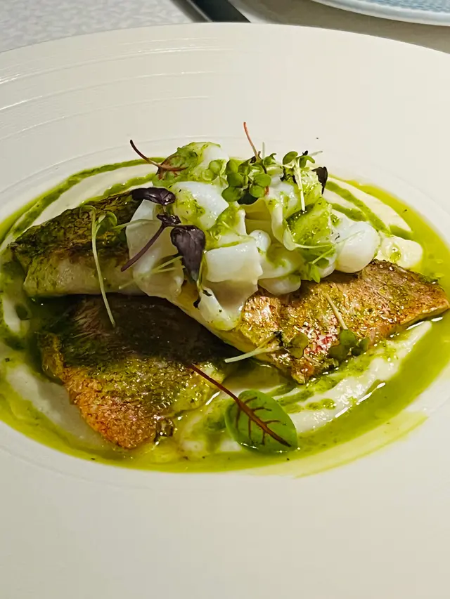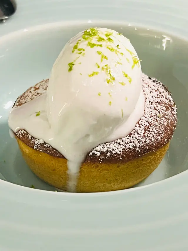 主菜有慢煮羊肩及石斑, 前者用上炭烤爐處理預先慢煮過的羊肩, 簡單的Rosemary肉汁, 吃起來有濃濃的炭香, 羶味平和, 口感沒有一般慢煮菜式的軟溶, 層次分明. 後者外皮煎香, 肉質中庸, 在上面舖上魷魚和用上青醬, 海鮮和魚肉鮮味夠, 當然魷魚的口感也令魚肉本身的口感更豐富. 最後的蛋糕中間放入椰子雪葩, 新鮮焗起的蛋糕和冰凍的雪葩結合起來, 就是簡單的冰火感覺.