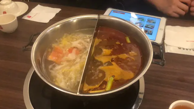 我地叫咗個鴛鴦鍋,清湯嗰邊有酸菜,可以不停加,而辣嗰邊有豬紅都可以任加,辣嗰邊就好濃味,我好鐘意食。