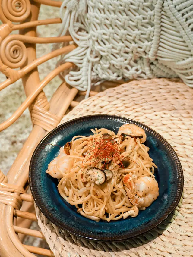 剛上菜已經被它陣陣的蒜香味給吸引到了 扁意粉的硬度適中 蒜香味道很重 另外加了其他的配菜 雜菌跟洋蔥碎跟幾隻大蝦 雖然是乾炒 但不會太油膩