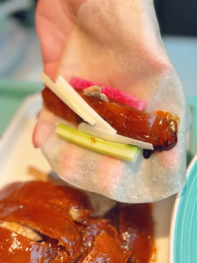 半隻片皮鴨片,熱烘烘的餅皮,包裹香嫩的鴨肉及富有油香的鴨皮、青瓜🥒蔥絲等等,加上特製醬汁,真係滿足感爆燈。