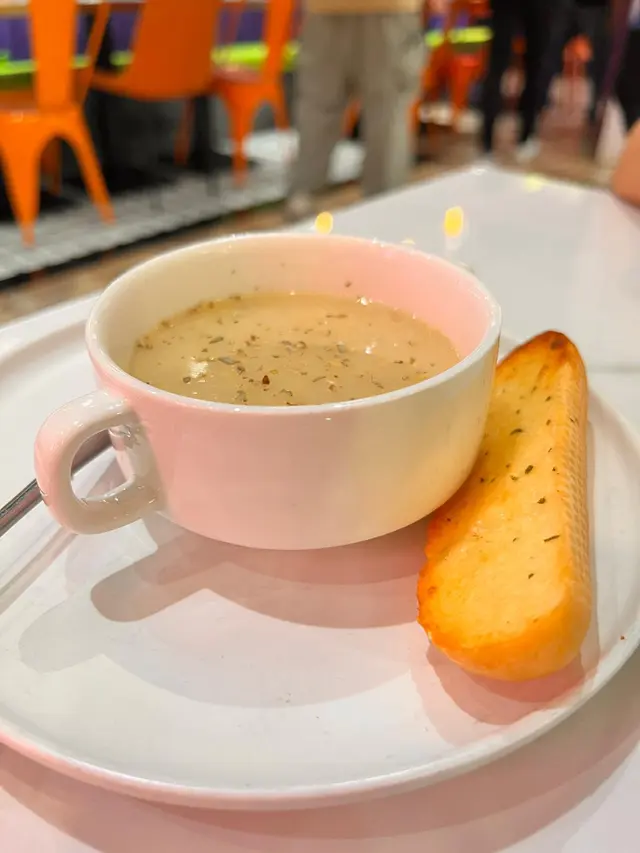 上首先上場有餐湯配蒜蓉包,蒜蓉包好香牛油味,脆卜卜