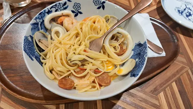 行開誠品,見到間嘢好似幾有風格就同女友入左去坐低,我諗住食啲穩陣啲既嘢就叫左個蒜香辣椒炒意粉,等左我成9個字,傕完個樓面,5分鐘後終於有得食,恭喜發財,碟意粉炒到出來水汪汪咁,完全冇味,有味既得啲辣椒同啲灼過既海鮮,講真真係從未食過咁難食既炒意粉