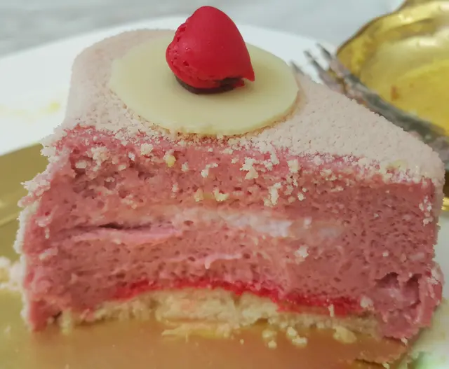 荔枝慕絲的確幼滑非常,而且中間的奶凍奶味濃郁,而且每一口都散發出淡淡的玫瑰香味,荔枝是5-6月的果物,如此應節的味道,實在沒有欺場,而那顆心型的macaron即使再小,也吃得出那種蛋白的餅的煙韌,蛋糕又不會太甜,即使已經吃了兩個蛋糕也不覺得太「漏」,果然是只下了2/3的糖,讓人吃到新鮮生果或是材料的天然甜味,在這個世代不以死甜的味道來吸引顧客,實在難找~