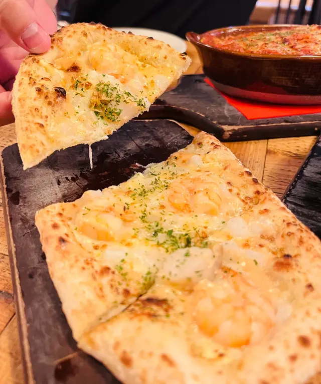 披薩是薄批,烤得金黃酥脆;配料有大蝦及帶子,非常爽口,