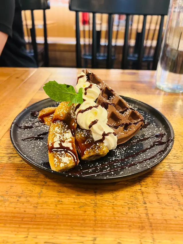 整個窩夫都是濃濃的朱古力口味! 配上焦糖香蕉及香草雪糕,冷熱交融,
