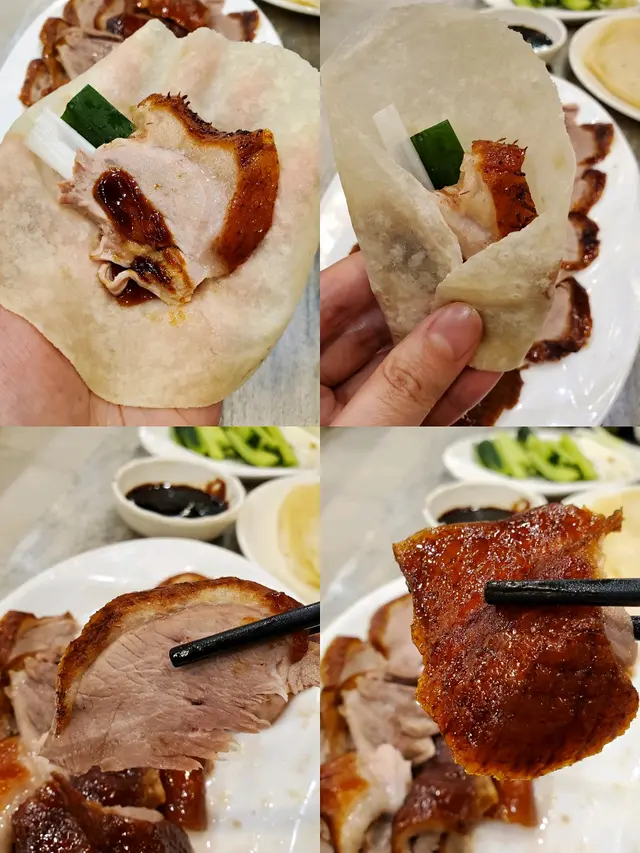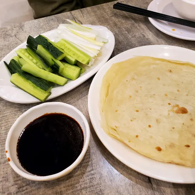 鴨肉嫩腍,唔會乾,連住少少脂肪好香,鴨皮好薄好脆身,入口好香唔算膩。加爽脆青瓜同提香京蔥,配搭填鴨醬料同鴨肉,用煙韌微回彈的餑餑皮包著食,味道岩岩好,口感豐富。