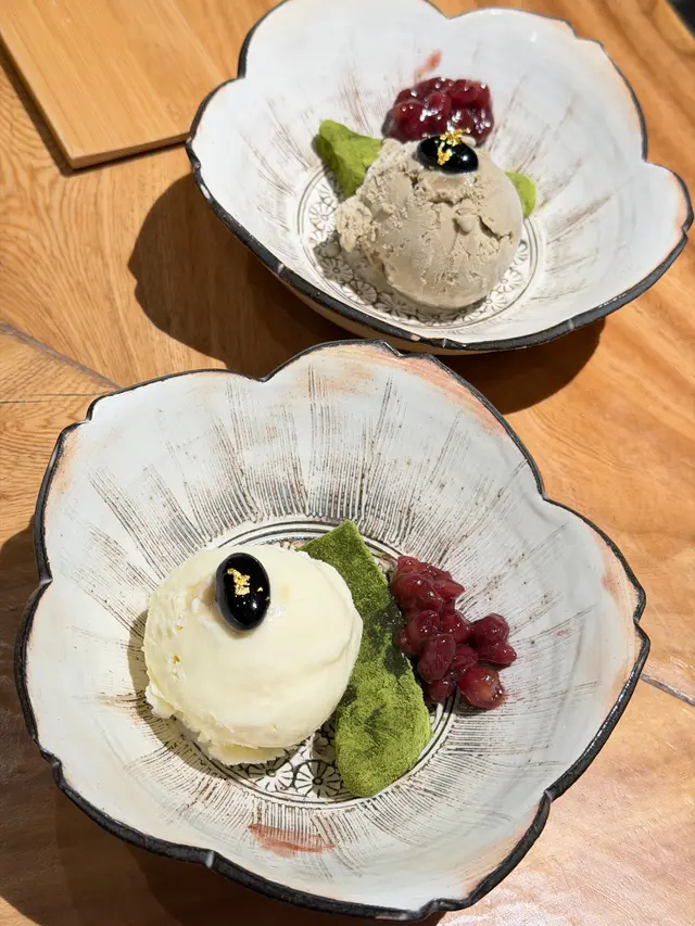 焙茶雪糕太絕了!溫溫的堅果香混著茶香,還有點淡淡的木質感,配著糯嘰嘰的蕨餅和甜紅豆蓉。