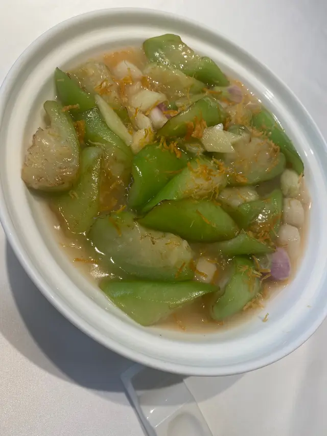 金湯浸節瓜,節瓜湯厚肉爽身,帶點點鮮甜,再加上元貝仔,及榨脆咗元貝絲,食落新鮮美味