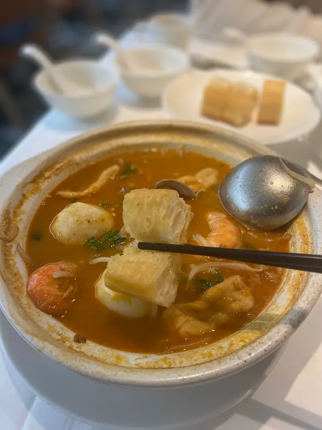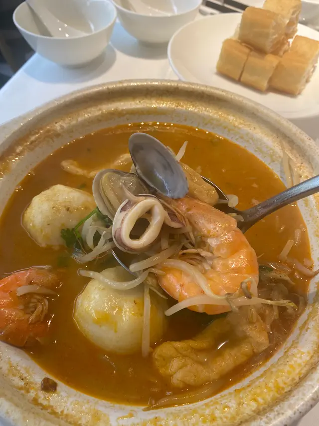 沙茶味湯底,飲落鮮甜充滿海鮮味道,材料包括大蝦、魷魚、特大魚蛋、豆乾、芽菜絲、蜆肉,仲配有油炸鬼用嚟索晒個湯嚟食!