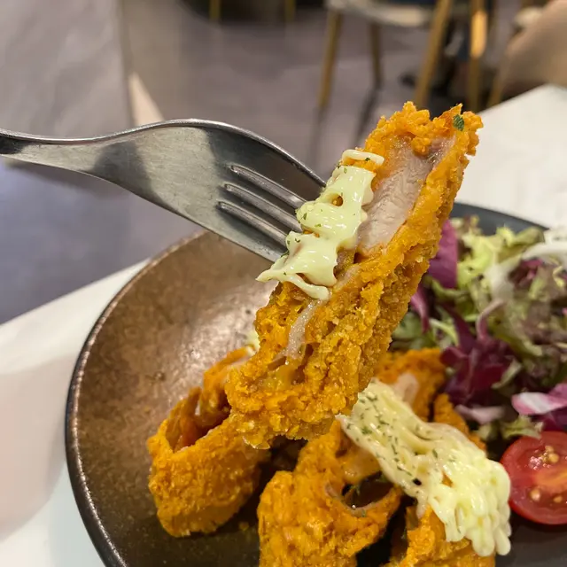 一開始以為香辣雞塊是小小一塊塊,但上菜後才知道是把整塊雞扒切成四份。整體很香脆可口,上面的沙律醬好像中和了炸皮的油膩感,但味道普通,也不算很辣~