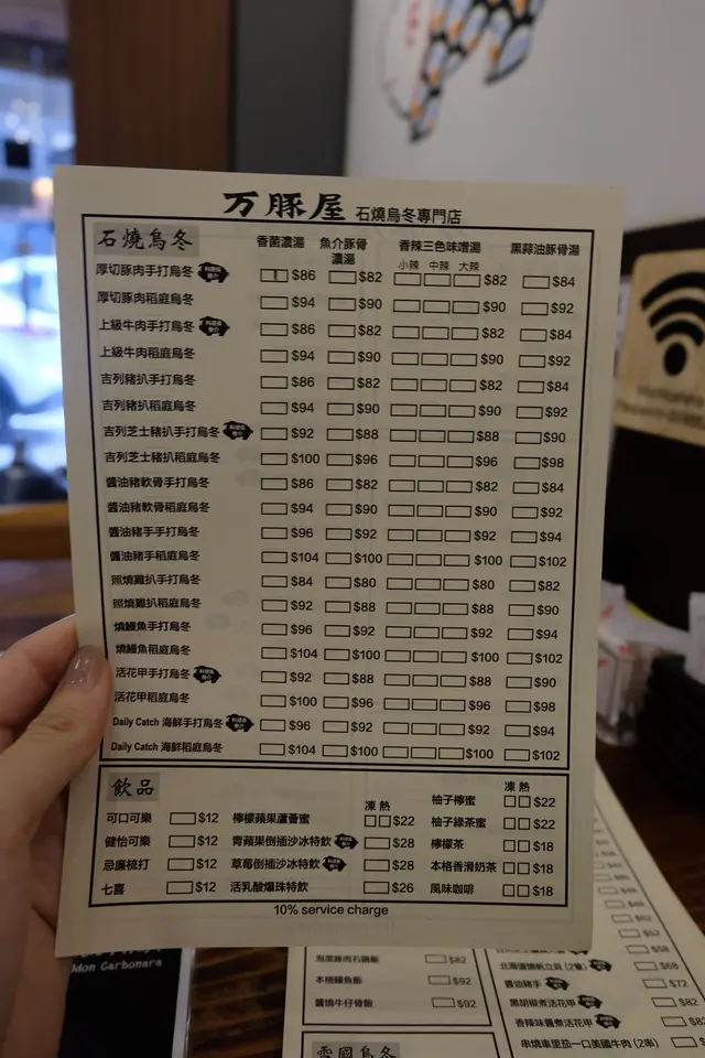Menu點餐紙,清晰而見,石燒烏冬系列,一共有20款之多。其中推薦厚切豚肉手打烏冬、上級牛肉手打烏冬、吉列芝士豬扒手打烏冬、活花甲手打烏冬和daily catch 海鮮手打烏冬。價格由$86-$96 不等。至於湯底就有4款選擇,分別是香菌濃湯、魚介豚骨濃湯、香辣三色味噌湯和黑蒜油豚骨湯。款式方面,我絕大多數是點厚切豚肉手打烏冬;湯底則香菌濃湯或魚介豚骨濃湯,這樣就太會搶了豚肉的味道。