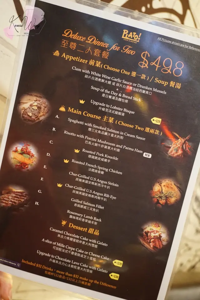 晚市都有幾款二人SET套餐, 當然更有散叫小食、意粉、意大利飯、Burger、Pizza、甜品, 同埋多款特飲。種類都幾多, 而當中更有幾款係岩素食朋友, 選擇性多。
