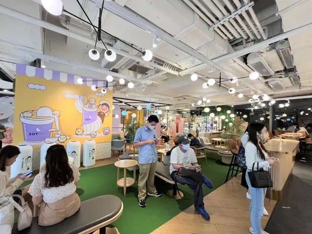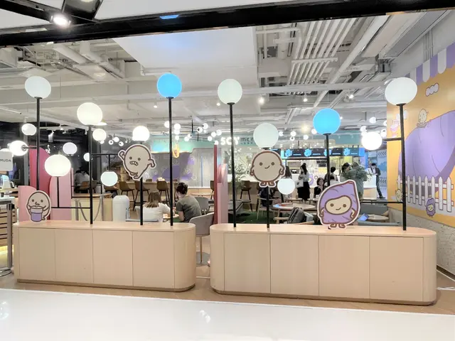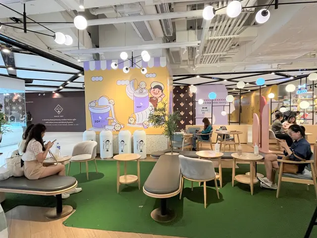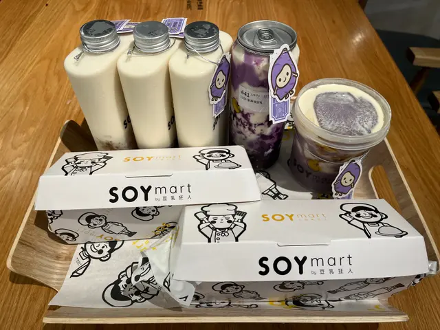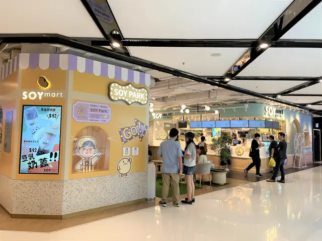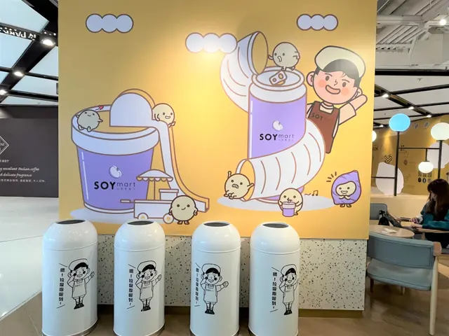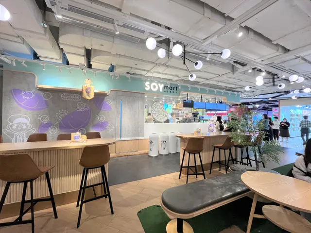 下班去買些外賣回家給家人吃,之前家人喝過芋泥豆乳後覺得好喝,所以再來買一些回家和在店內吃一些。店內粉色的設計,以豆乳狂人的主角SOY Jai裝飾為主,牆身和座位都很適合打卡。一個個圓形的燈球,晚上在玻璃的反射下,更顯得夢幻。