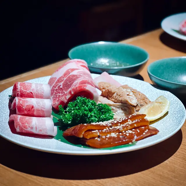 呢款盛合有五花肉、梅花肉、豬皮同豬腸🙈份量好多,五花腩嘅油脂啱啱好,包蒜頭生菜食一流😋豬皮用醬油漬過,食落軟淋味道唔錯🙂↕️