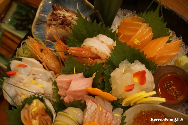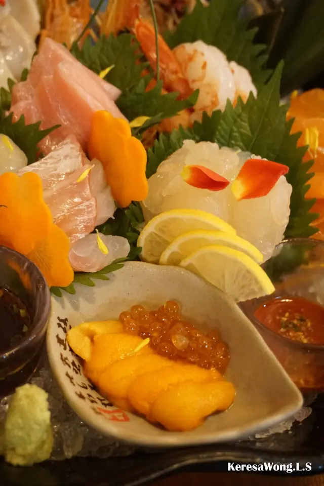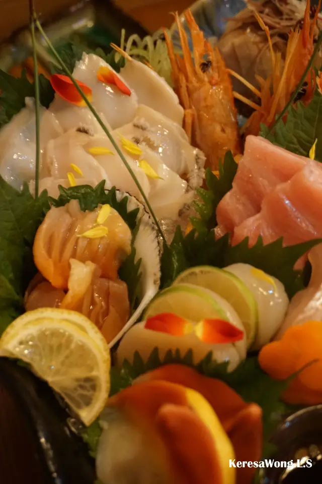 半隻澳洲龍蝦刺身鮮甜爽彈、中拖羅魚油豐富、三文魚富有魚香、珍寶赤蝦肥美爽甜、帆立貝夾住青檸, 令味道鮮甜清新; 鮮活赤貝同埋南非鮮活鮑魚雖為薄切, 但仍為爽脆兼冇腥味; 三文魚籽伴海膽, 海膽入口即溶, 甘甜美味; 仲有厚切鯛魚, 沾酸醋食, 更加提鮮; 北寄貝開邊唔韌, 而當晚併盤中, 原本油甘魚就以鰤魚代替, 同樣出色鮮味。