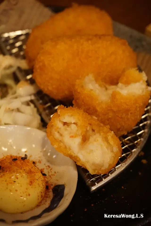 軟骨棒表面金黃, keep到香甜肉汁, 夾集了爽脆軟骨碎, 沾上蛋汁食, 令口感滑溜。
