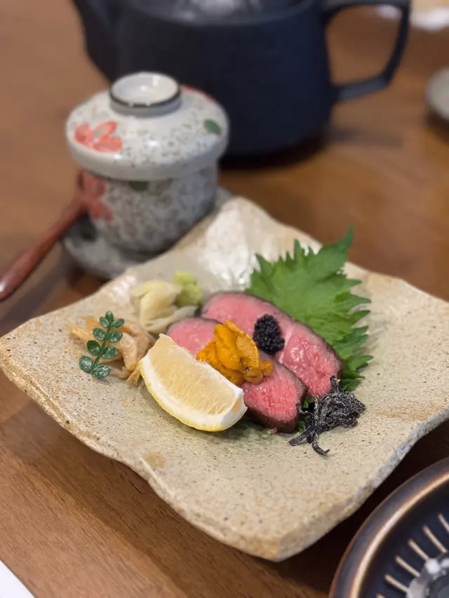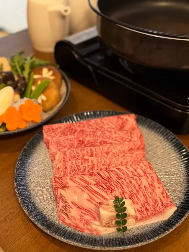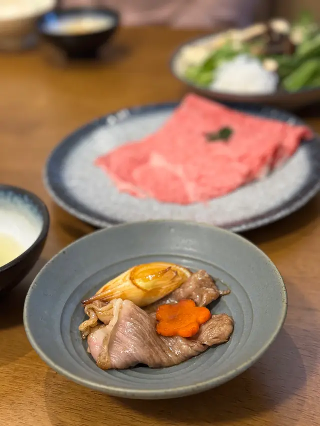 套餐包括宮崎A5和牛、前菜、茶碗蒸、招牌壽喜燒、海鮮湯同甜品,全程由專人席前烹調,確保味道同和牛最佳熟成下呈上