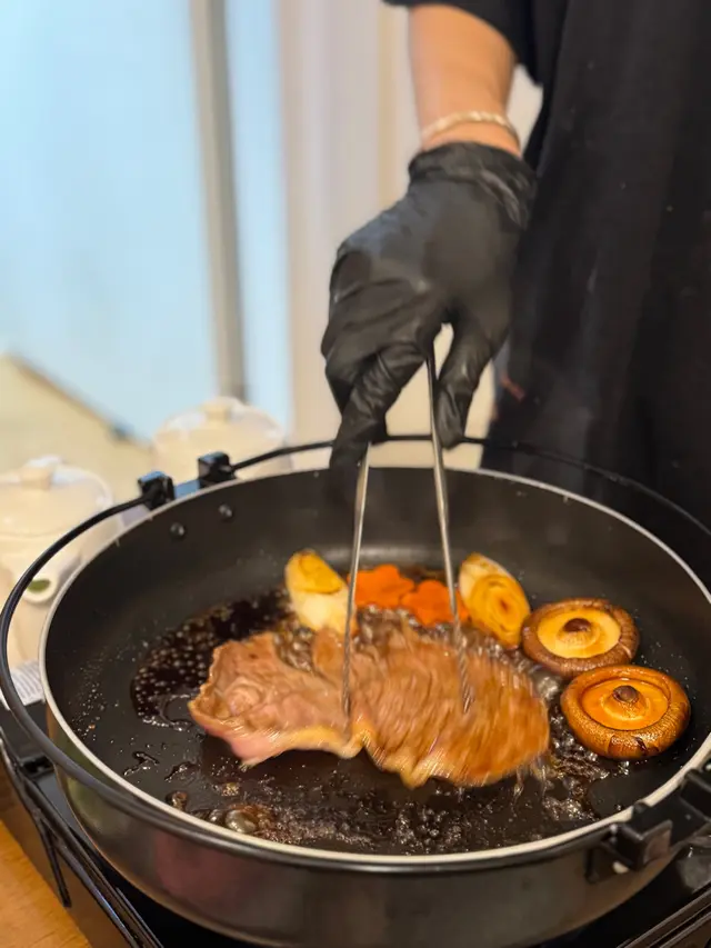 包括豆腐、冬菇、大蔥、洋蔥同芋絲等,店員會按次序同和牛一齊烹煮,感覺同喺日本食一樣