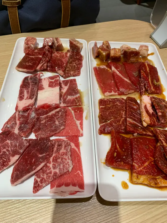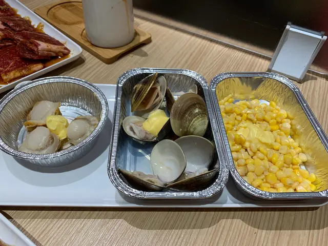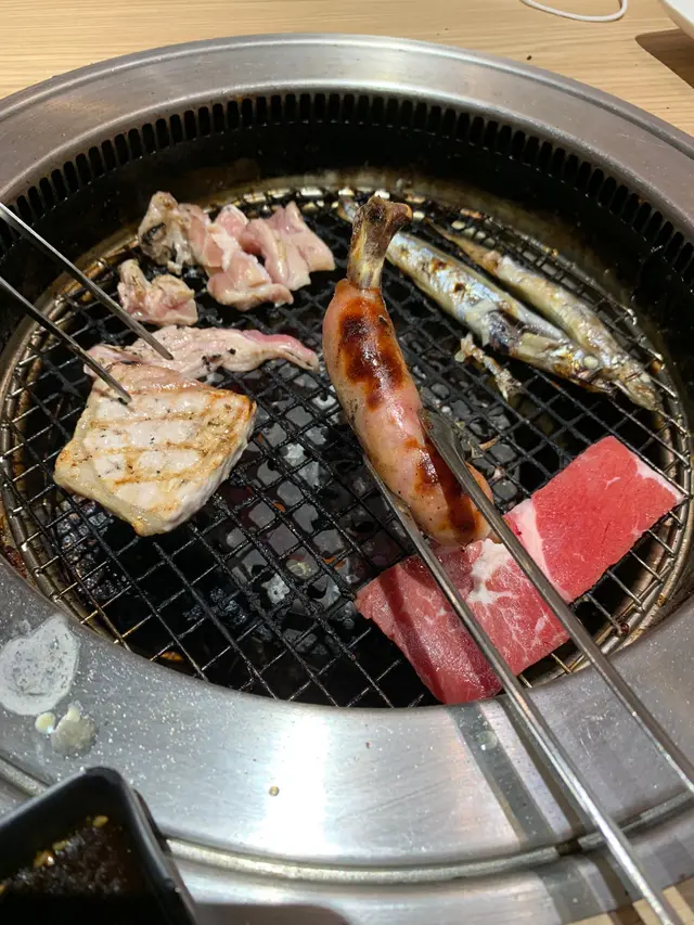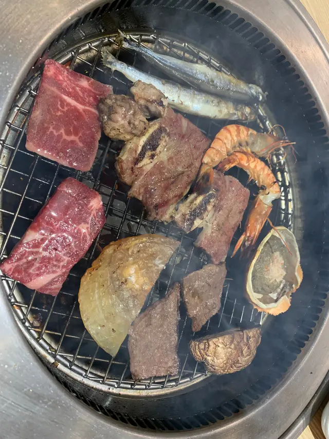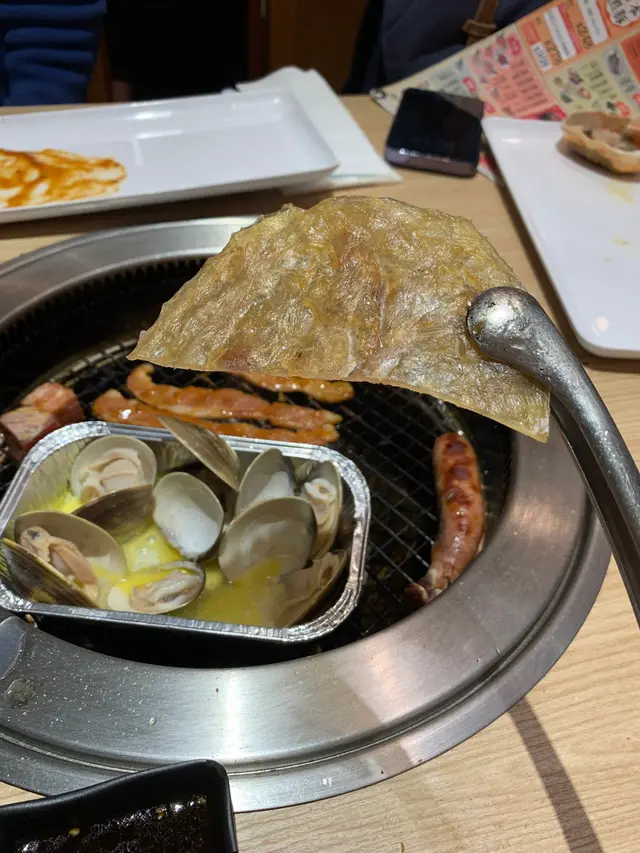 佢仲有海鮮好似係牛油帶子, 蜆, 蝦咁. 但必食之選係雞泡魚干, 牛骨腸同甲羅燒, 呢3樣真係回本之選甲羅燒無論屋企點焗都冇燒得咁好味, 出面一個都要幾十元, 而家可以任食, 蟹膏正到爆. 雞泡魚干千其唔好燒得太耐, 配上酒簡直一流, 無論食到幾飽, 呢d 小食都食唔停, 牛骨腸又係貴貨. 呢3樣好少燒肉店比你任食. 大讚.