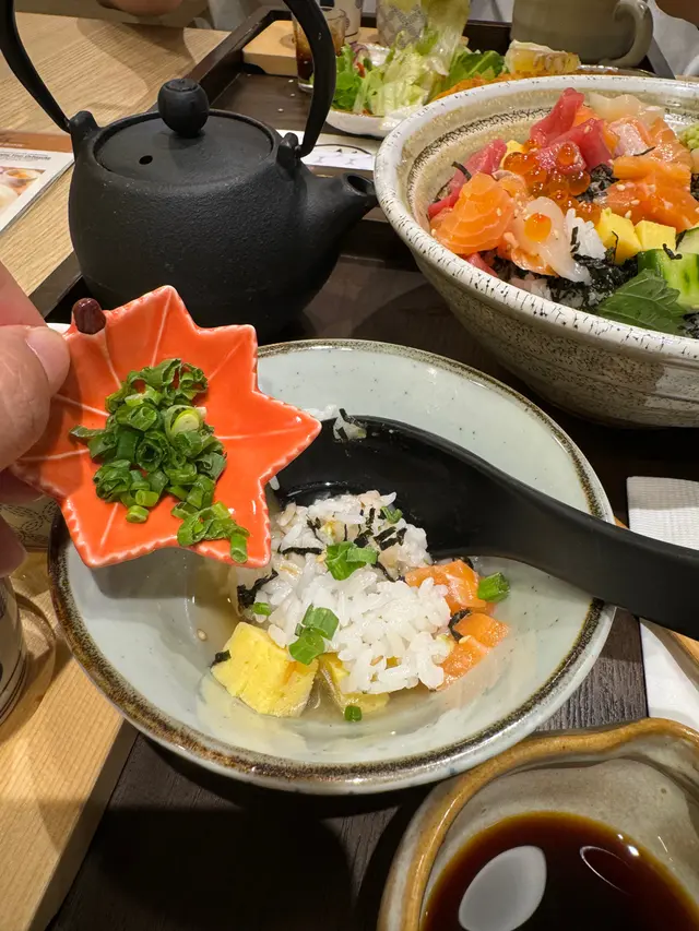 第二種食法係將刺身飯,同埋一啲山葵加入碗中,再倒入茶漬,豉油和蔥,呢個食法你會食到茶漬加豉油加蔥令到味道層次提升幾倍