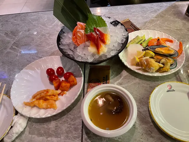餐廳用電話落單,上菜速度都頗快。出面仲有一個自助區,凍海鮮(蝦、螺、青口)、前菜、湯、熱盤、麵飯、甜品同飲品一應俱全。飲品選擇最多,由罐裝汽水、茶,到自己斟既橙汁、雜果賓治,仲有大喜屋常有既清酒都有供應。