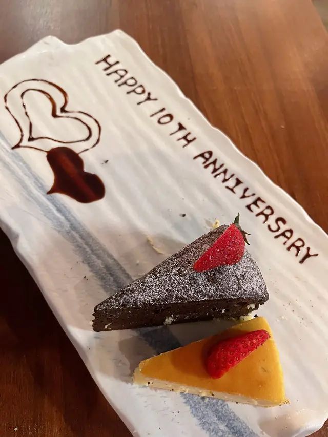 最後甜品,芝士蛋糕同埋朱古力蛋糕,餐廳知道我哋係慶祝周年仲寫左字比我哋打卡🩵好貼心
