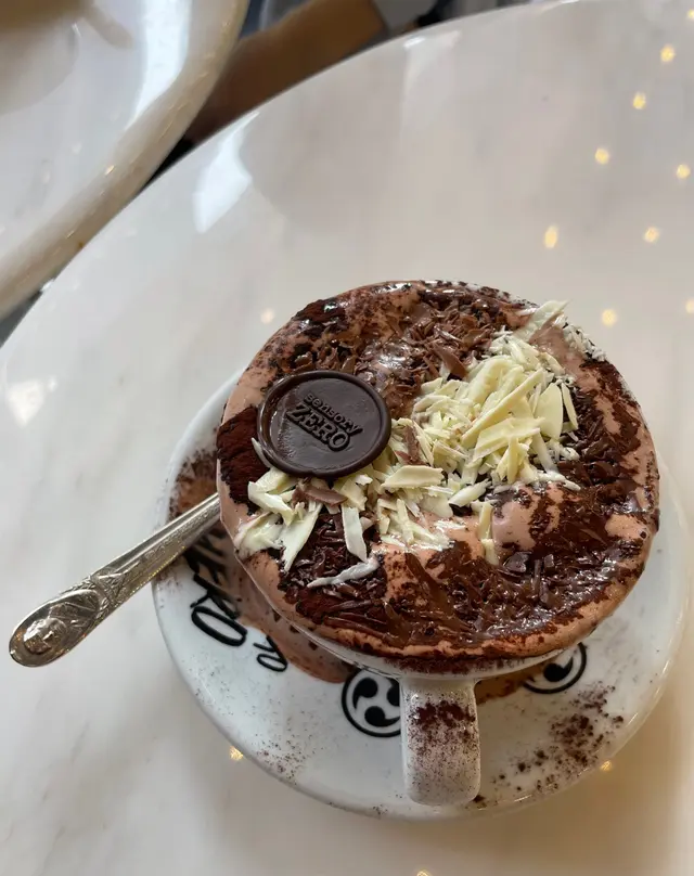 另一個吸睛的,就是餐牌上的那個朱古力特飲,好靚,好有藝術感。在滿瀉嘅朱古力上邊, 鋪上黑、白、牛奶朱古力碎。好creamy,好味。