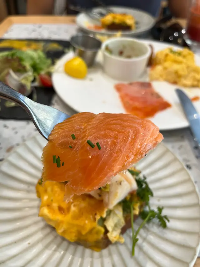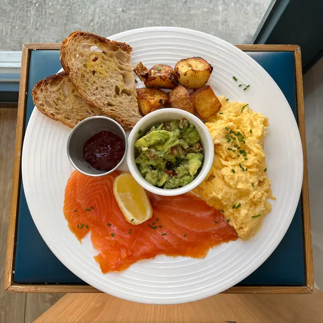 我點左一道All day breakfast,食材包括香滑炒蛋🍳、烤焗薯🥔、煙三文魚🍣、牛油果莎莎🥑同埋烘到卜卜脆嘅酸種麵包多士🥪。