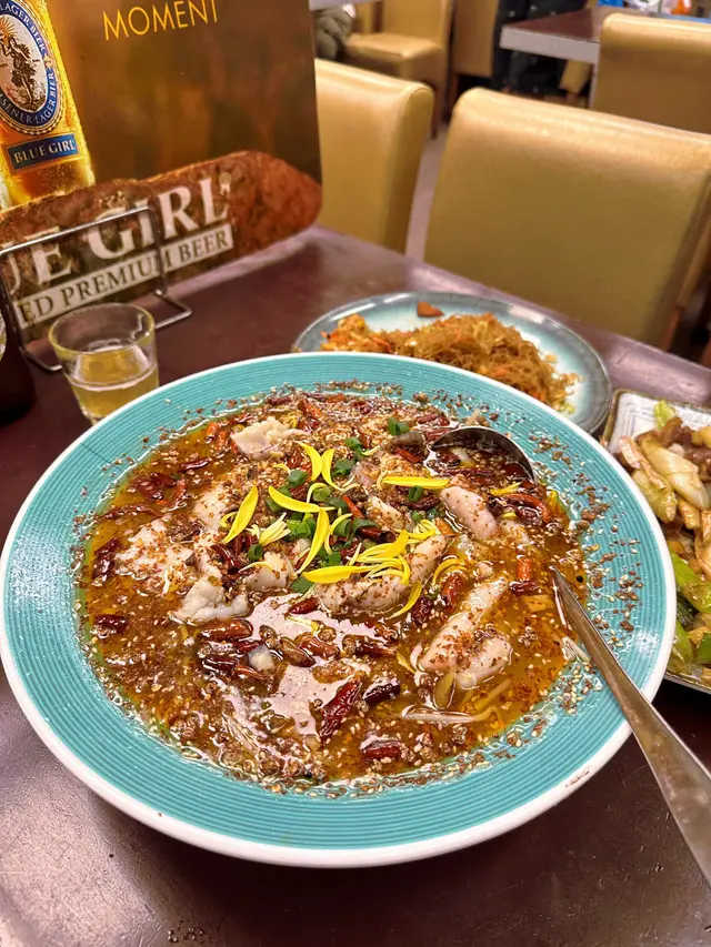 招牌酸菜魚: 酸菜魚份量十足,餐廳用咗整條黑魚包括魚頭魚骨,煲咗個靚湯,再喺湯底入邊加入酸菜,泡椒,酸筍將酸菜魚嘅酸度提升到唔同層次,再用花椒香油令到魚肉入口爽滑,香辣麻香恰到好處,一啖接一啖10分過癮。而且仲有大量配料芽菜同寬粉,兩個人食到好飽飽。