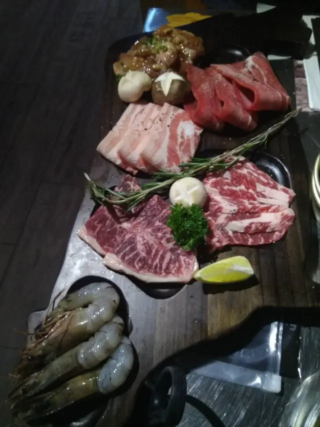 之後燒肉拼盤就到喇, 春川雞,牛前胸,大蝦,豬頸肉,五花肉等待。兩人份量黎講都算幾多。