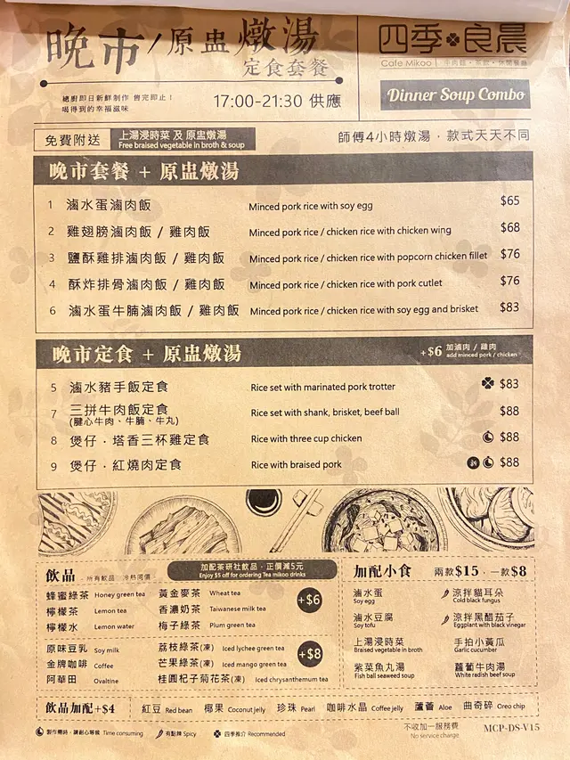 晚市黎講,套餐會比較便宜,70幾至80蚊不等啦,晚市套餐仲有埋原盅燉湯,感覺幾健康,仲要系師傅4個中燉湯,款式日日吾同架。
