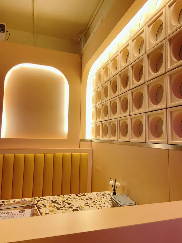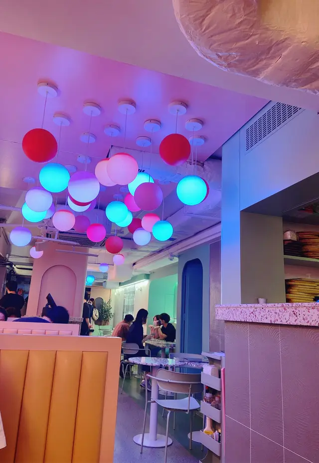 當日就安排咗我地坐樓下,粉紅同湖水綠色調裝潢,天花以玩味波波燈作裝飾,打卡一流!
