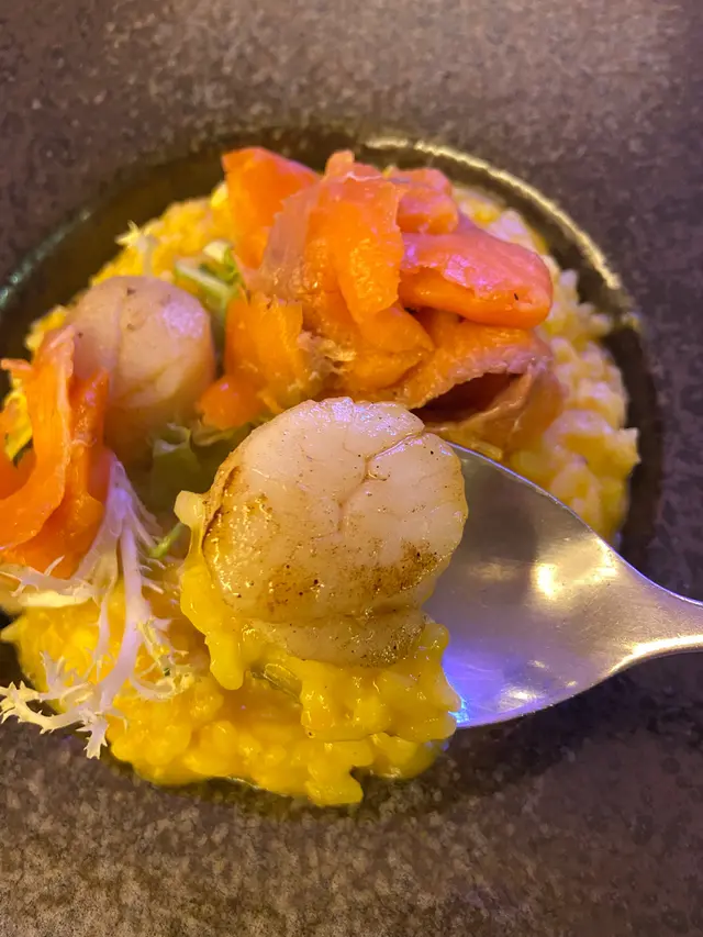 意大利飯有淡淡南瓜味,味道正常普通,配上份量唔少嘅煙三文魚,同煎帶子,不過意大利飯偏濕太多汁