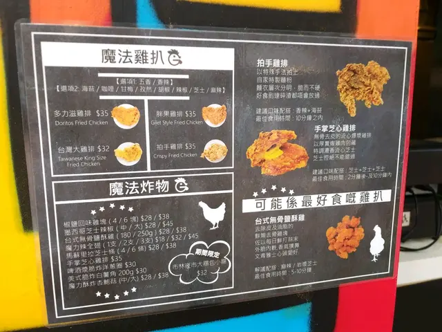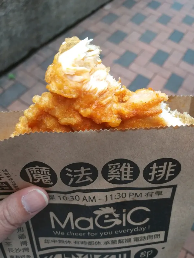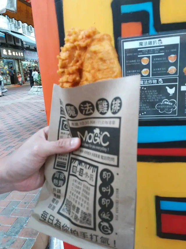 懷念台灣雞排 stephanielam18Level 42019-05-0474 views Follow 今日去荃灣路德圍掃街食野,比我發現咗有間小店食台灣炸雞,鍾意食台灣野喺我,梗係要試吓啦。門口有彩色噴畫好sharp,所以一行過就比佢吸引到。佢地喺餐牌都係炸雞為主打,我選擇咗多力滋雞排辣味+孜然味,佢地係即炸,等大約5分鐘左右就出爐,雞排size好大塊,有成個紙袋咁大塊,咬一啖發覺佢喺脆漿唔太厚,啱啱好,食果時嘅味道好似同平時果d好唔同,問一問店員先知,呢款炸雞嘅炸漿加咗玉米粉,個皮真係勁好食,個皮加埋辣味粉同孜然粉,好香,而咬落去雞排有汁流出黎,好juice,一d都唔鞋。下次一定要試埋其他味道。The above review is the personal opinion of a user which does not represent OpenRice's point of view.LikeShare懷念台灣雞排 魔法雞排 https://s.openrice.com/QrKT0zz3Cm0Report Post Ratings5Taste4Decor4Service5Hygiene5ValueDining MethodTakeAway
