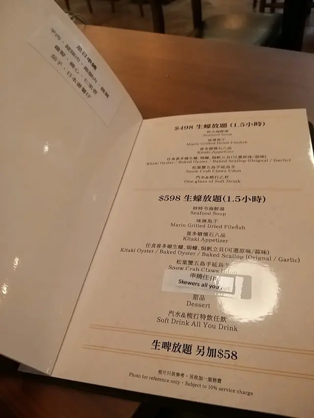 90分鐘生蠔放題🦪,分成$498及$598兩個價位,差別在於串燒任食及一杯汽水或梳打變任飲。另加$58可享生啤放題