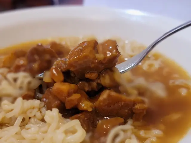 我點選了早餐 E 套餐,主食是出前一丁,其煮製時間控制得恰到好處,食用時軟硬適中,煙韌彈牙。而配料五香肉丁更是自家製出品,務求打破傳統小丁兩三粒的罐頭肉丁,轉改用進口的凍肉自行切粒,並加入秘製醬汁而成,味道鹹香不辣,軟嫩鮮美,讓人吃過後回味無窮。