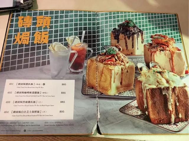 有磚頭焗豬扒飯、磚頭咖哩軟殻蟹飯、磚頭焗白汁芝士海鮮飯、蝦多士、羅麥辣味雞翼同埋千層朱古力西多士