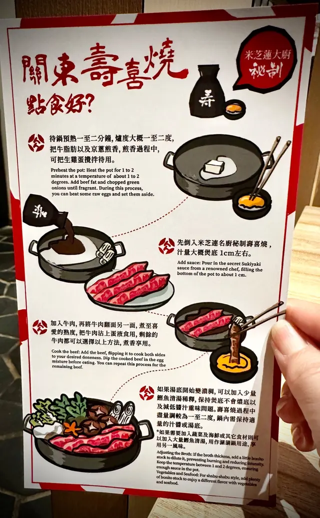餐廳好貼心已經準備一些紙張教導怎樣食關東壽喜燒?原來壽喜燒汁係米芝蓮名廚秘製㗎!唔怪之得咁好味!