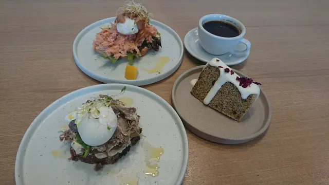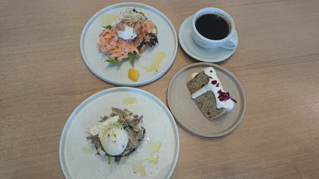 威士忌木桶煙燻鮭魚忌廉芝士酸種麵包比想像中大份,有隻流心蛋,三文魚偏鹹,麵包搽左忌廉芝士,食完都飽肚。