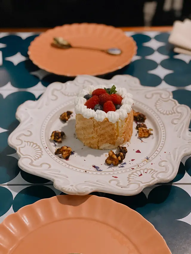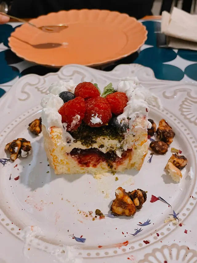 擺盤就很少女心💕蛋糕份量兩人分剛剛好,是帶有口感的海綿蛋糕,伴碟的nuts都非常好食!