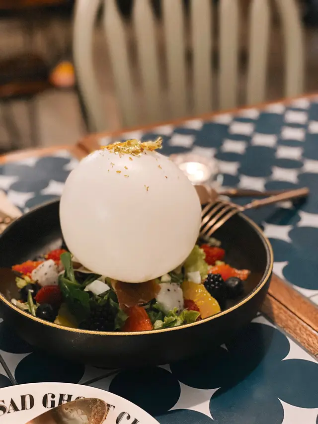但事實是很普通的一款沙律+吹脹成氣球的水牛芝士,上枱時店員貼心提示水牛芝士沒有味道,不過可以食......ummmm 只有非常淡的水牛芝士味,口感乾硬,只是覺得棄之可惜,還不如少一點噱頭,喜歡正常的水牛芝士......