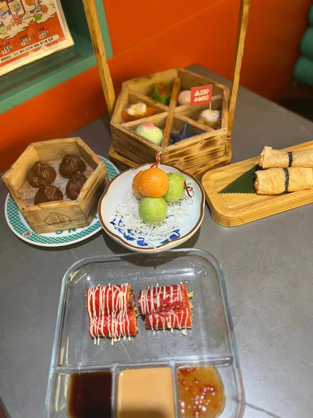 必點!以紅米漿製成既腸粉皮好薄,裡面包住好脆既春卷,再點埋甜醬同花生醬食,好滋味!