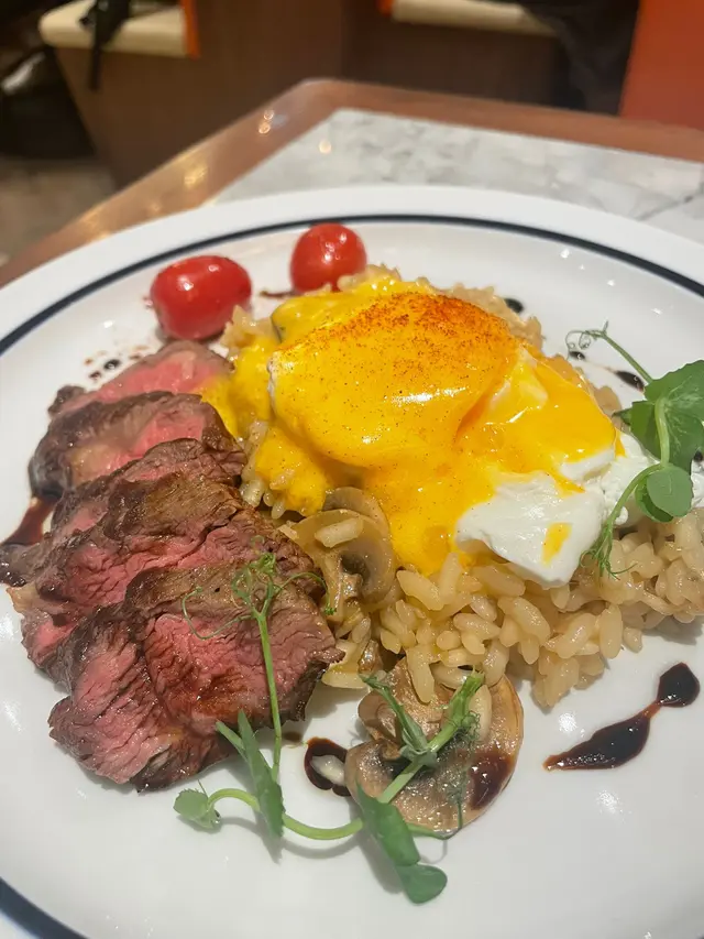 牛扒荷蘭汁意大利飯:牛扒煎得外焦內嫩,搭配濃郁的荷蘭汁同軟糯既意大利飯,味道均衡。飯中加入蘑菇增添了天然既鮮味,蛋黃的流心更為整道菜增添了絲滑口感,係一道令人滿足既主菜。