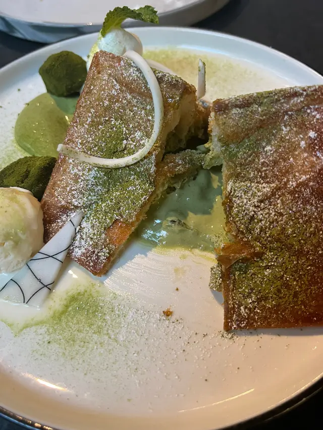 最後梗係食埋佢新出嘅甜品啦😬 牛油酥係一層層嘅麵包 好香牛油味 切開入面仲有抹茶醬🤩 唔會過甜仲有啲抹茶苦澀味 味道啱啱好~ 配上綠茶蕨餅同埋雪糕 不錯😌
