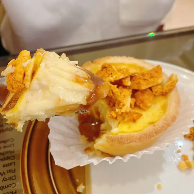 相比之下呢個蛋撻嘅味道係成餐最好的,沒有之一。 曲奇撻皮食落無咁油膩,而且脆卜卜,蛋撻面頭鋪滿焦糖趣趣,望落好似好甜,但食落還好,係可接受的程度,蛋漿稱唔上好香滑,不過內藏焦糖流心餡就真係好驚喜😍😍 即刻加返少少分,係用心之作👍🏻