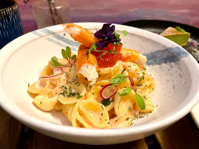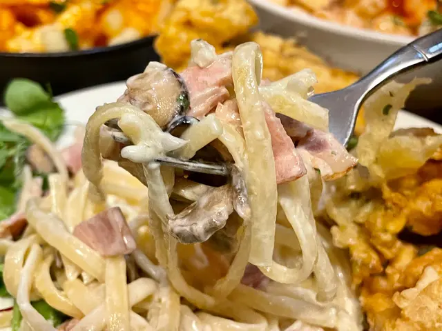 成隻軟殼蟹喺上面超吸晴,隻蟹好好肉而且唔覺梅,食落去仲有汁流出嚟,完全唔會乾爭爭,份量好似成隻手掌咁大!下面卡邦尼係用左扁身意粉,口味比一般的卡邦尼更清爽,唔係好張好濃果款汁,配料有大量菇菇同煙肉,性價比超高,推薦必吃!