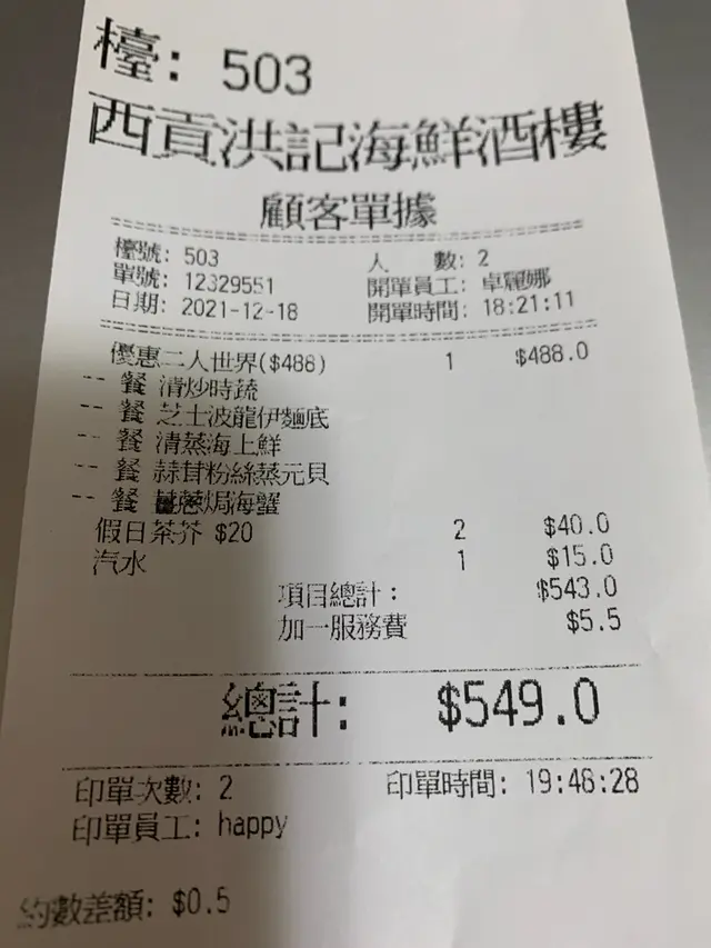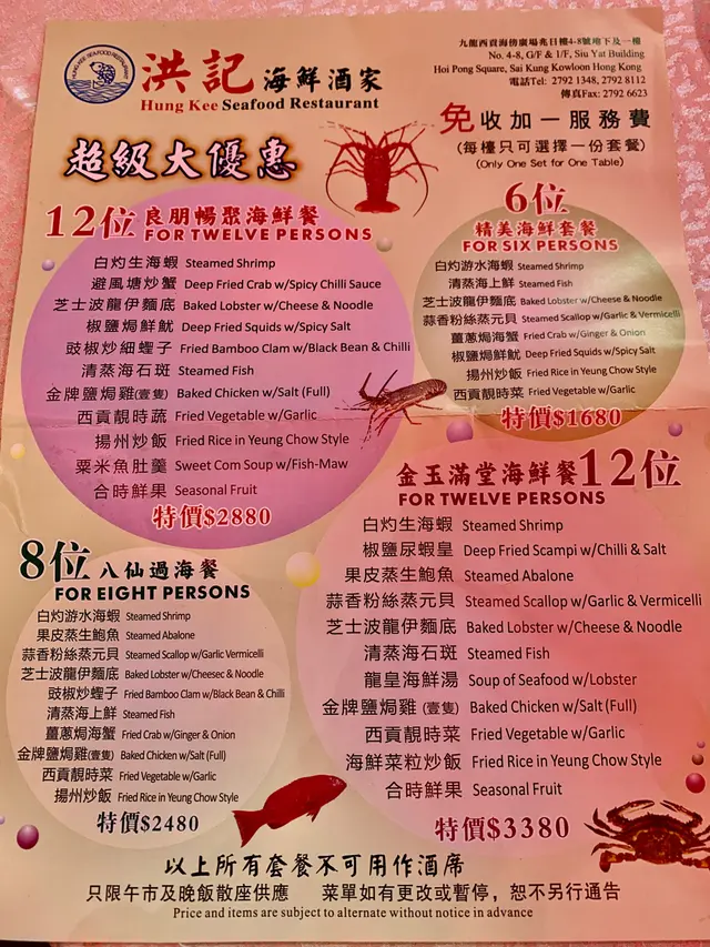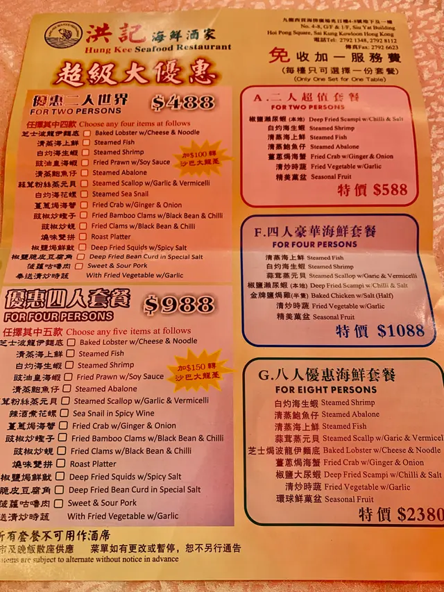 看了幾間附近的海鮮酒家,最後選了洪記海鮮酒樓二人套餐,酒樓賣點是免收+1服務費, 優惠二人世界餐$488 ,可從14款海鮮及小菜中選擇四款(共有11款海鮮及3款小菜供選擇),再送清炒時蔬一 碟。