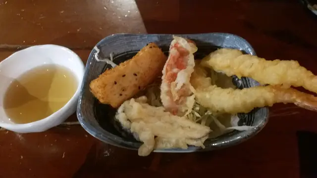 大蝦天婦羅,茄子天婦羅 ,蟹棒天婦羅,都脆口。 炸雙皮奶,外脆內軟, 甜味剛好, 值得嘗試。